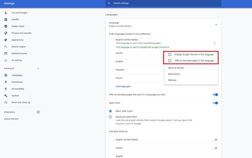 situé côté droit dans le navigateur, sélectionnez la langue et marquez