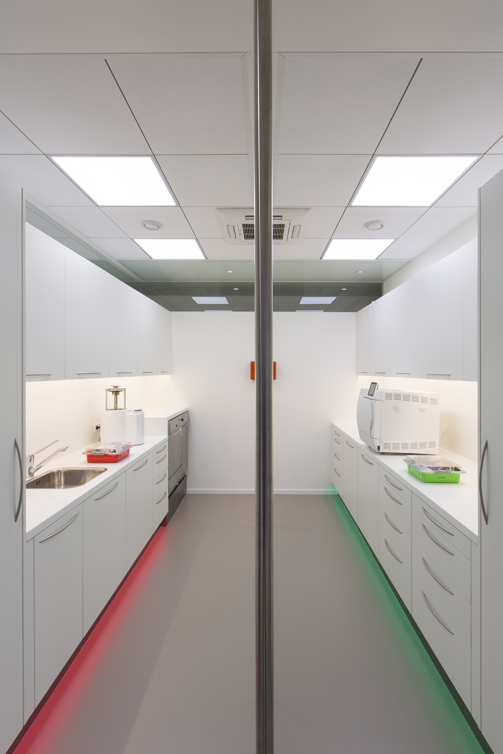 The clinical part was also challenging. The hallway is less than a meter wide. If everything was built from bricks it would be a horrible place to be. Therefore we made the walls out of glass and we used them as a support for cabinets. The cabinets float above the floor and they can be accessed from both sides. In this way I gained some space to add to the hallway and I took some space from the treatment room without any effect to the usable area.